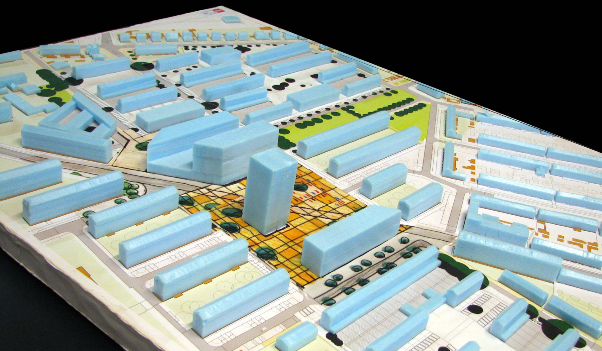 De eerste stap is het plein terug te brengen naar de menselijke maat door het toevoegen van twee woonblokken en een woontoren. Zo ontstaat tevens de mogelijkheid het woningaanbod in de wijk te differentiëren. Door in de plint van de woonblokken publieke functies zoals winkels, supermarkten en maatschappelijke voorzieningen onder te brengen, krijgt het plein de wijkbrede aantrekkingskracht die het nodig heeft. Parkeervoorzieningen grenzend aan de winkels spelen in op het gemak van gebruikers en flexibel gebruik van de ruimte. Bewoners parkeren onder of in de woongebouwen. Waar de twee woonblokken opgaan in het ritme van de lineaire strokenbouw van Peutz, is de woontoren het alzijdige middelpunt op het plein. De toren steekt herkenbaar boven de wijk uit zonder overheersend te zijn.
